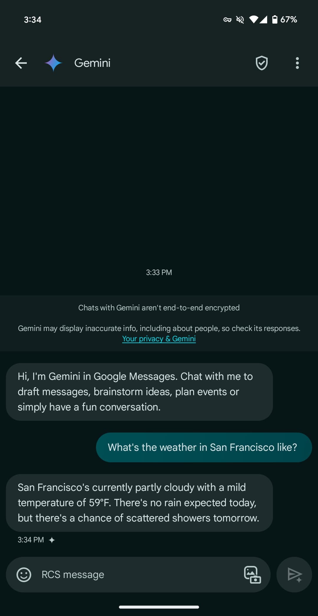 You can long-press on a response to leave thumbs up/down feedback, with the ability to star and forward also available. Conversations are happening over RCS, which has to be generally enabled, but they are not end-to-end encrypted. Gemini cannot be accessed usingmessages.google.com/web or the Wear OS app (where the chat won’t even appear).