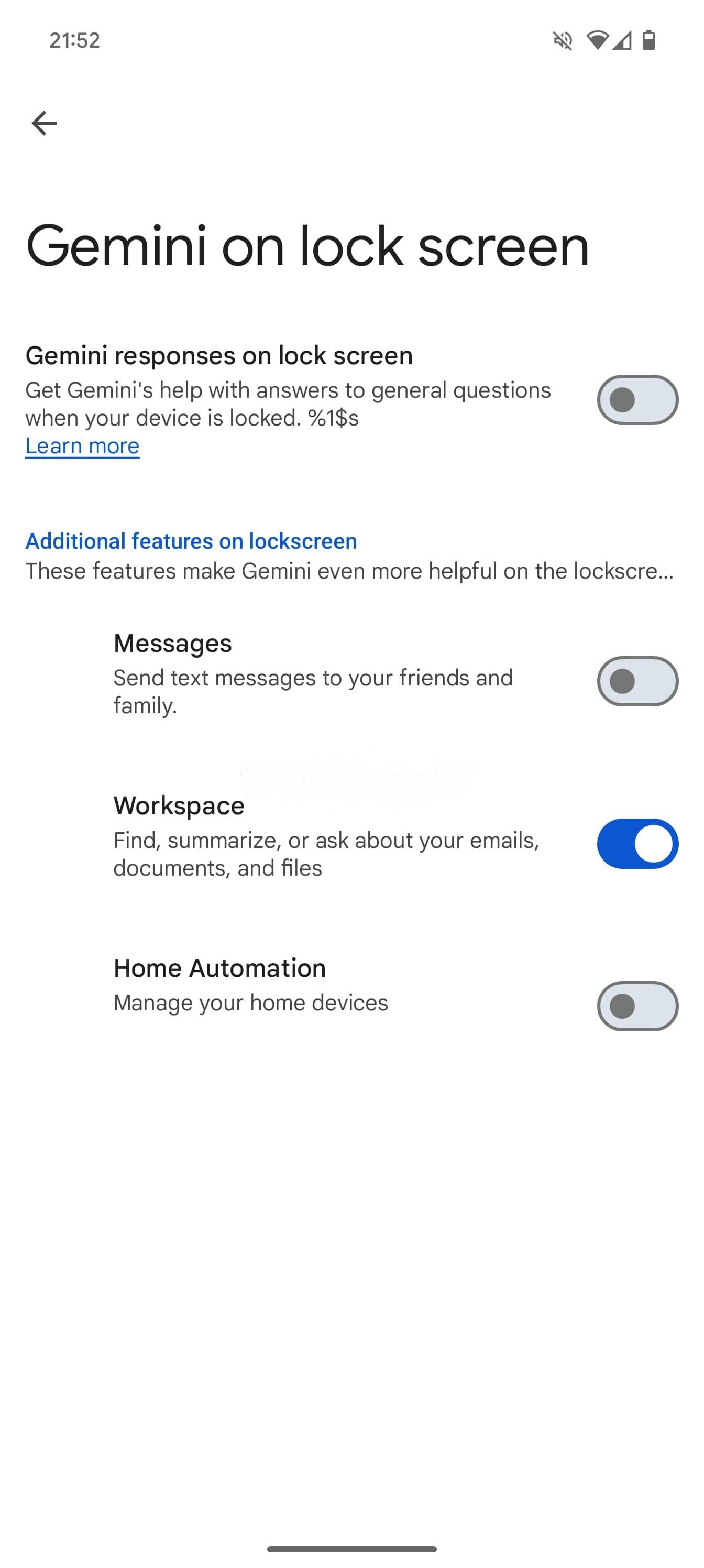 Moving forward, as we enabled below, setting up “Gemini on lock screen” and “extensions on lock screen” will let you get “answers to general questions and more.” Your options are Messages, Workspace, and Home Automation.