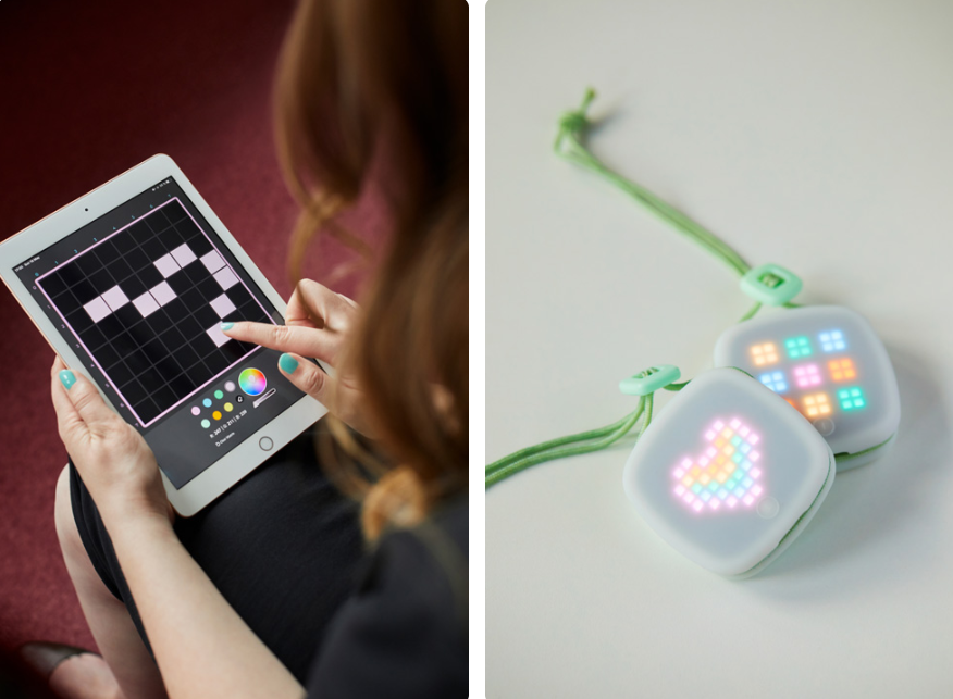From left to right: imagiLabs is a coding app and network empowering a community of girls who code. The imagiCharm is a smart accessory that girls can customize every day using the imagiLabs app.