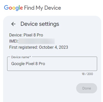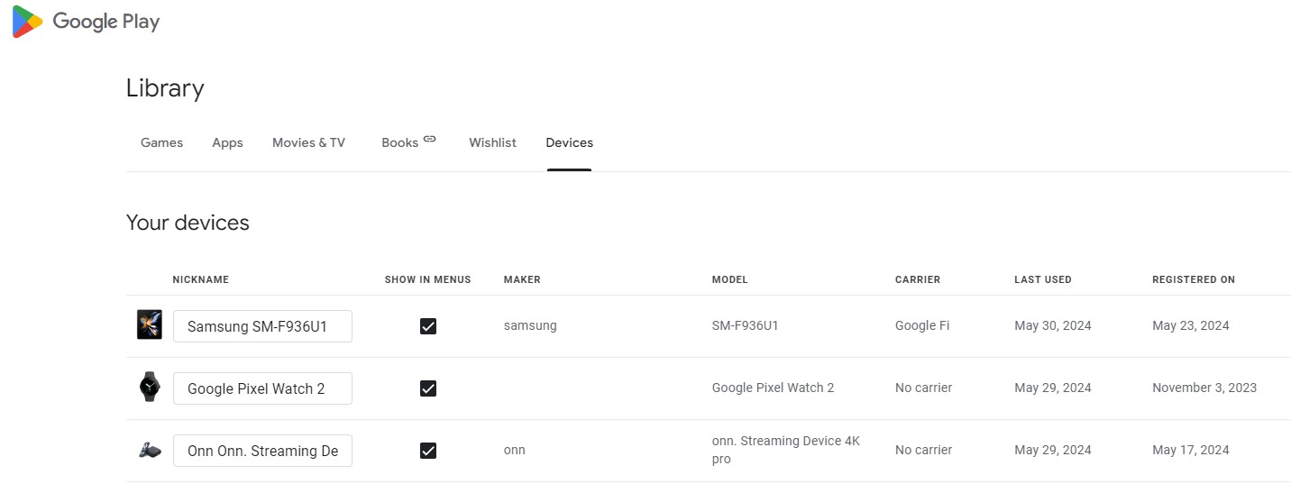 This page, accessible through the web at play.google.com/library/devices, shows a list of any devices you’ve been signed into. This page similarly lets you rename devices, and it also shows TV and Chromebook devices as well. Normally you’d use this page to edit the display name of a device in the Play Store’s web app install tool, but it also syncs to the Find My Device app.